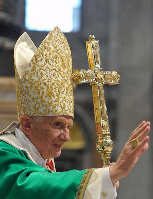 | El Papa Benedicto XVI en la ceremonia de canonizaciónes el pasado 21 de octubre. Usando el "fanón papal" vestimenta litúrgica reservada al Papa, y que casi no era usada hace varias décadas |